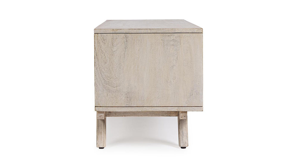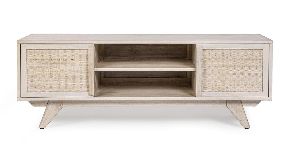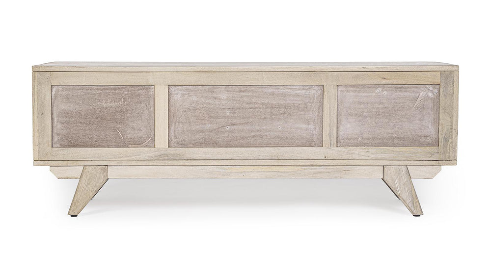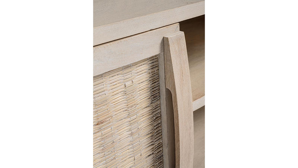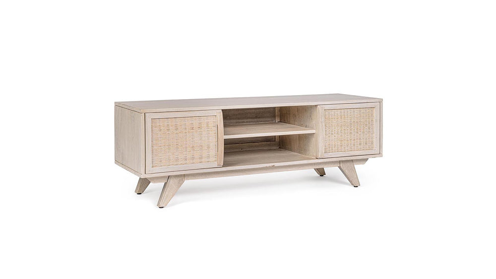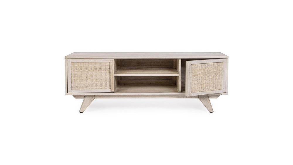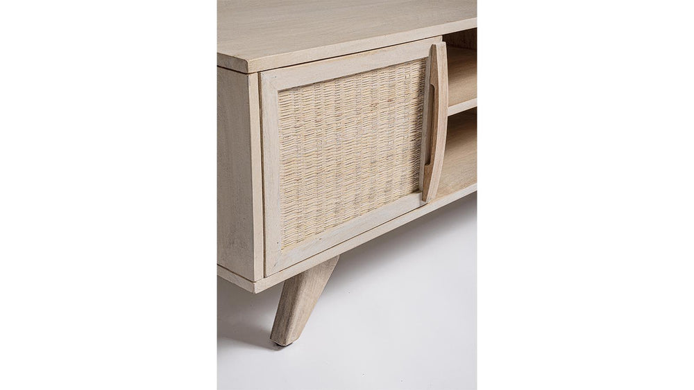 Il porta TV SAHANA è un mobile strutturato in legno di mango, schienale in mdf e frontale ante in rattan, verniciatura a base di nitrocellulosa con decapatura bianca.