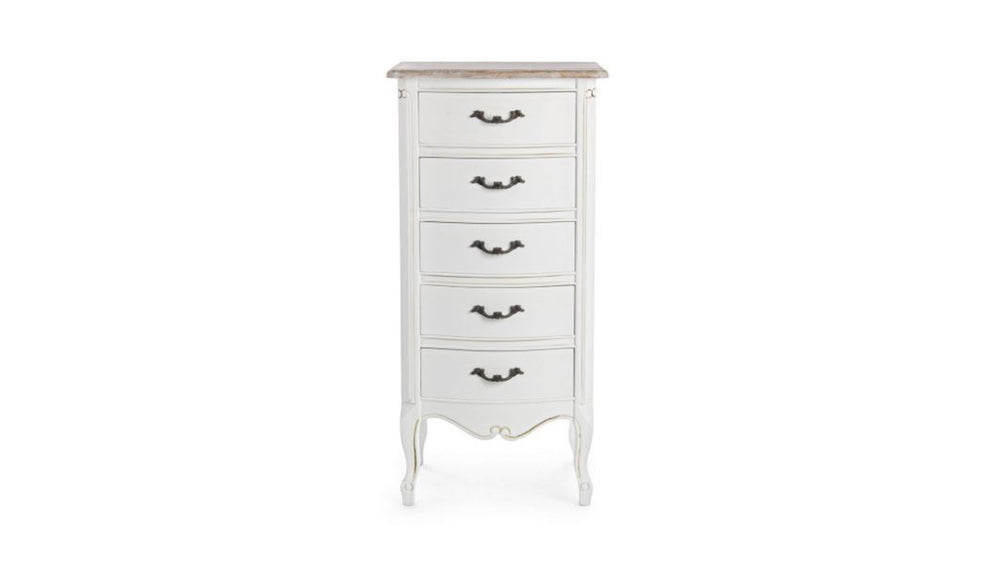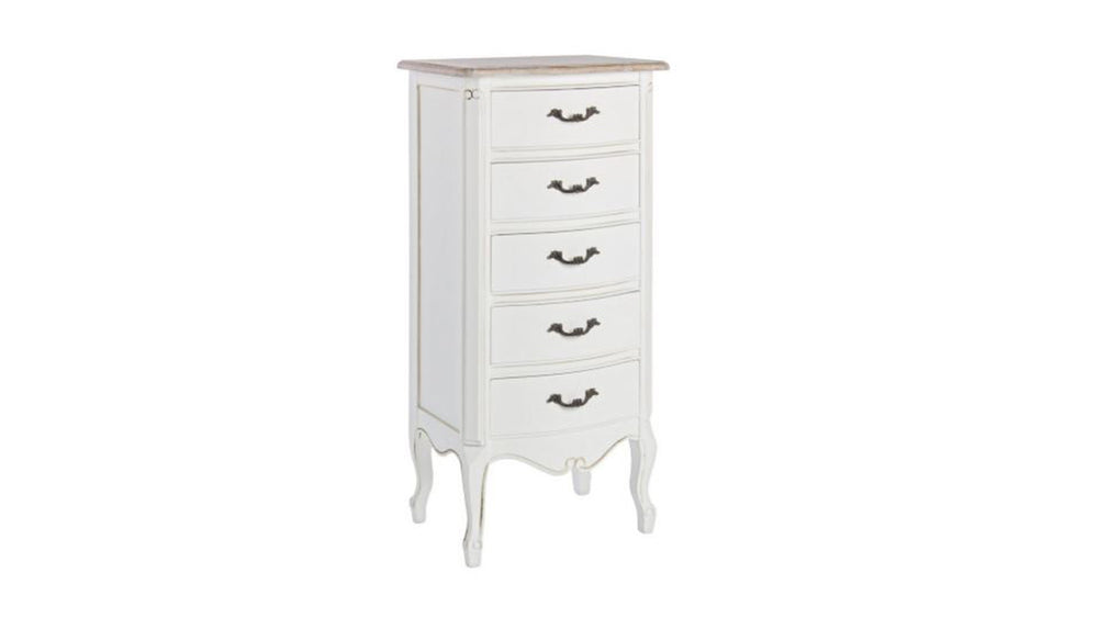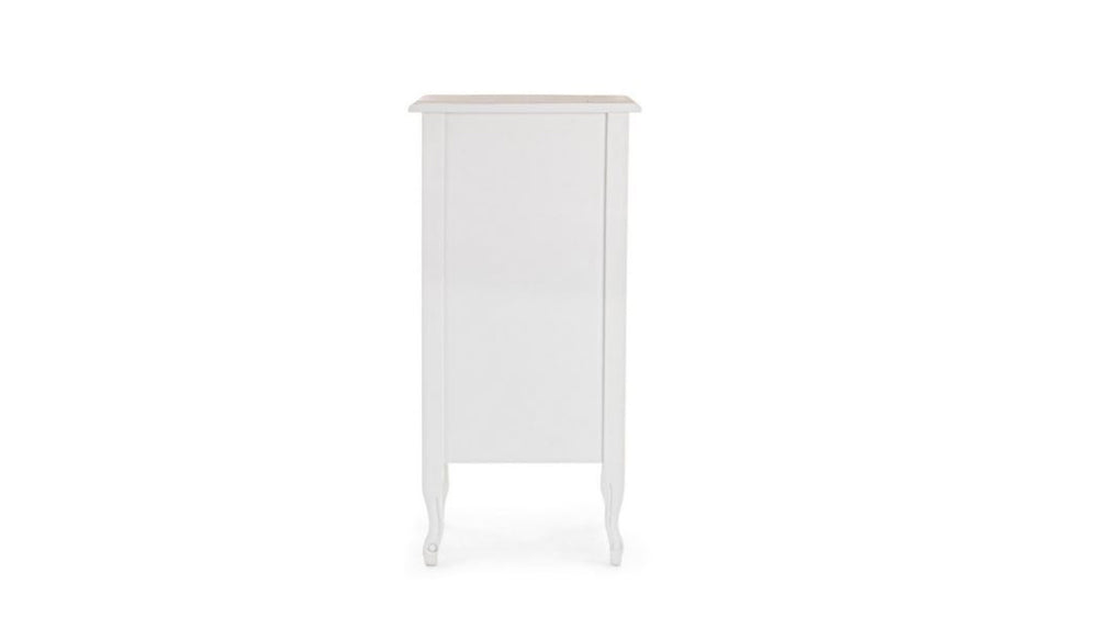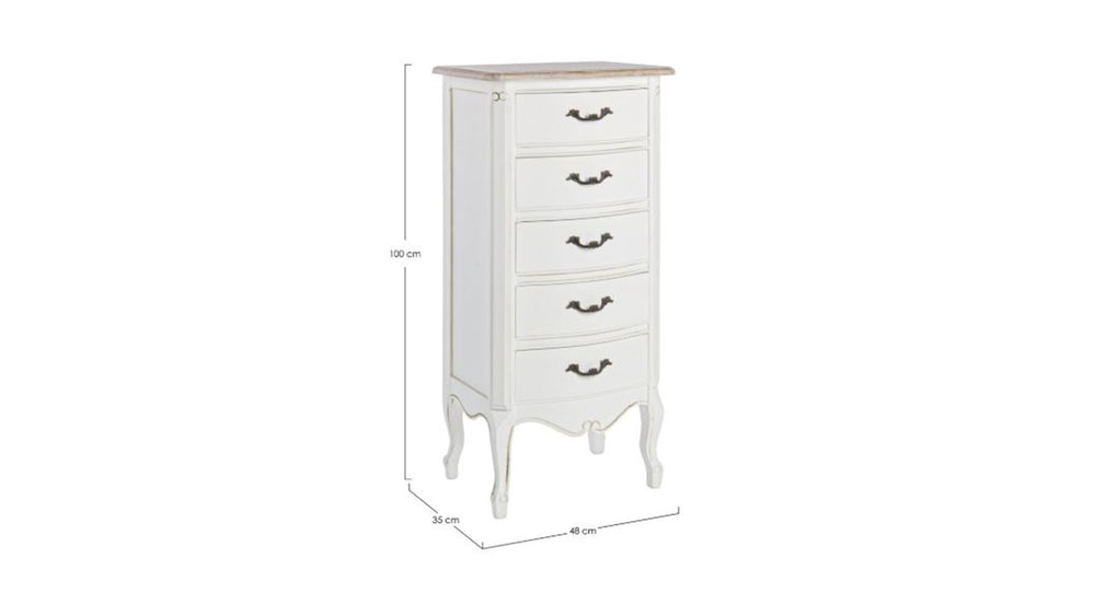 La cassettiera JUSTINE 5C è strutturata in legno paulownia con piano impiallacciato, pannelli in mdf, vernice a base d'acqua e maniglie in acciaio.