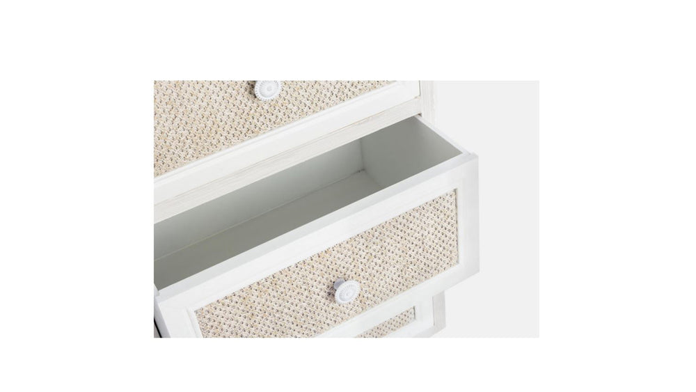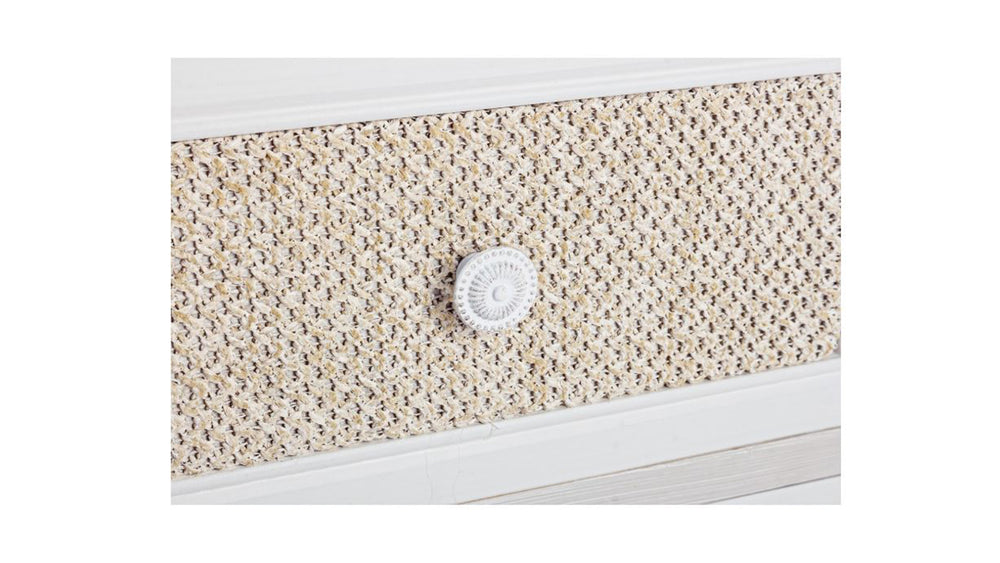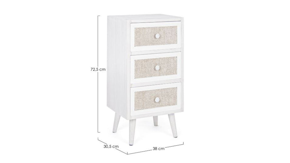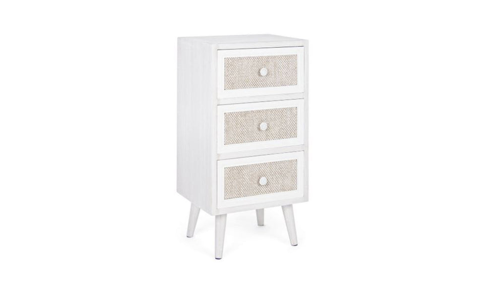 La cassettiera MONTIEL 3C ha una struttura in mdf con frontale cassetto rivestito in tessuto (cotone/lino) finitura con vernice a base d' acqua, pomelli in metallo e piedini da assemblare.