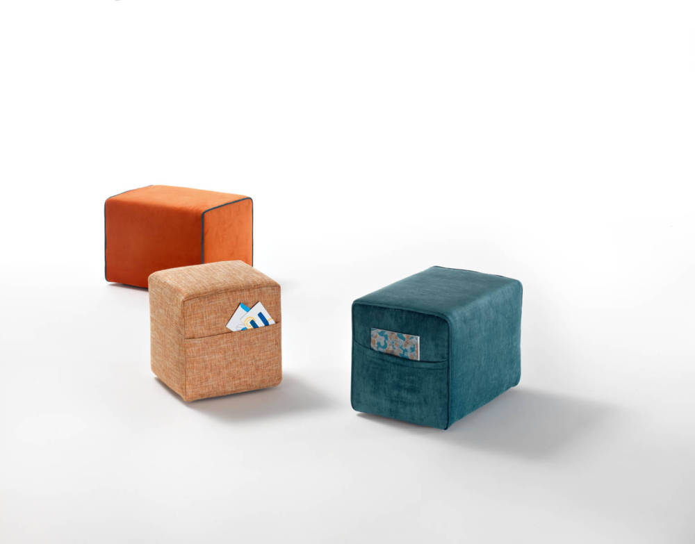 Apprezzati anche per la presenza di una comoda tasca laterale, i pouf TIC-TAC possono essere rivestiti in tessuto, pelle o ecopelle, e sono realizzabili sia in versione monocolore che con un bordino in rilievo con finitura in contrasto. I pouf in tessuto presentano un rivestimento completamente sfoderabile mentre i pouf in pelle o ecopelle hanno un rivestimento parzialmente sfoderabile.